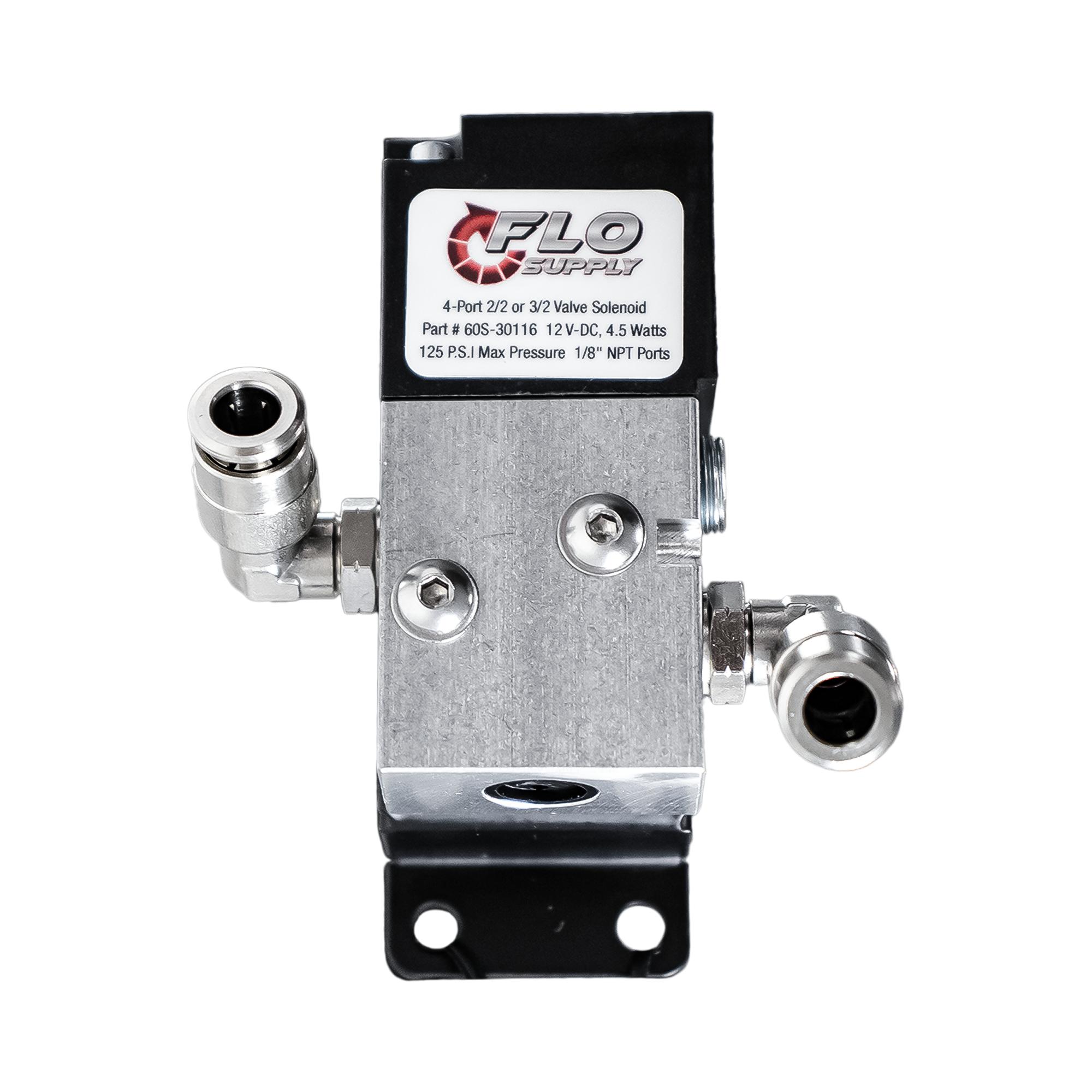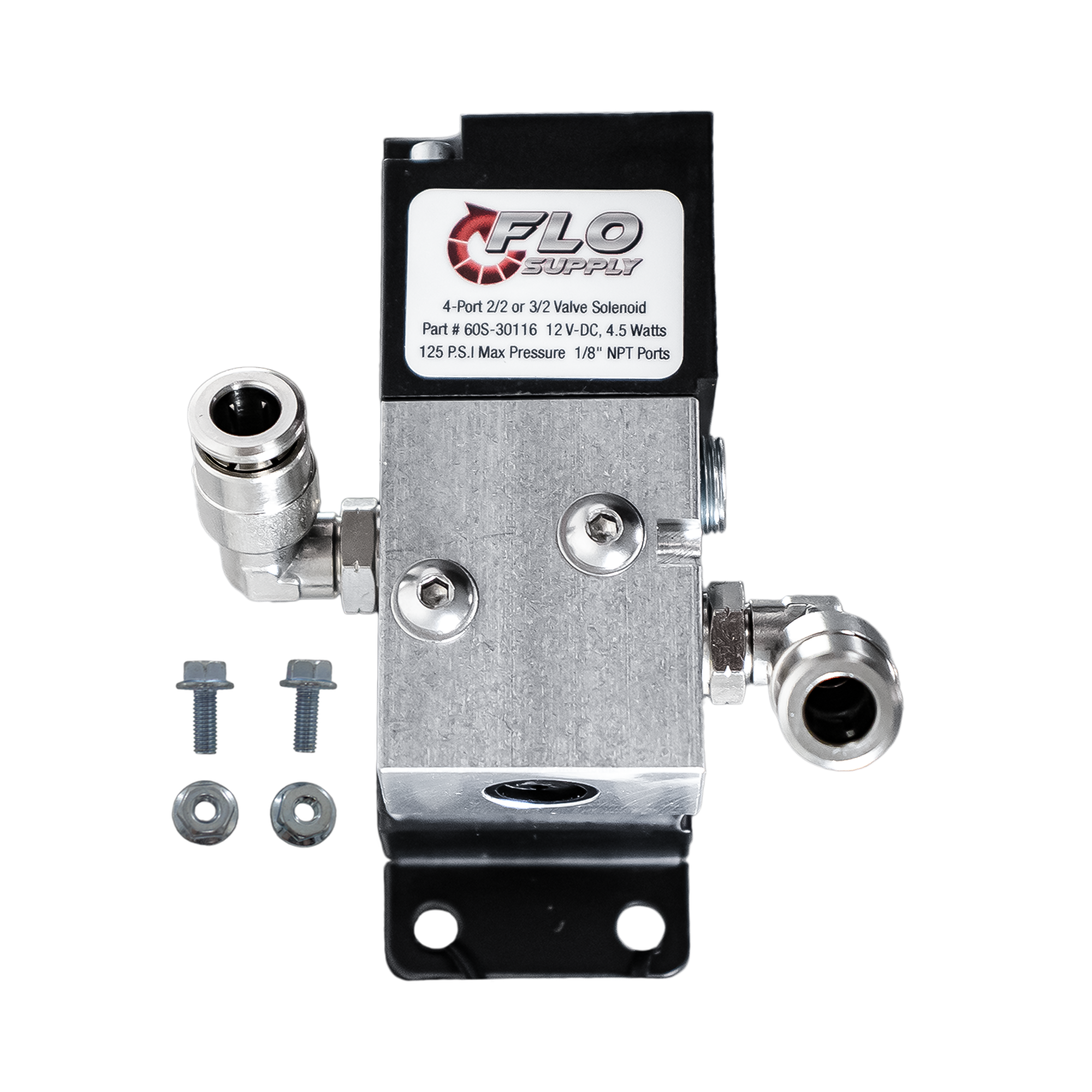 Take control of your pneumatic or fluid systems with the complete Flo Supply 4 Port Solenoid Valve Kit. This all-in-one package brings together our high-performance solenoid valve, precision-machined bracket, and the required fittings for seamless system integration—perfect for high-speed automotive applications like shifter and parachute control.