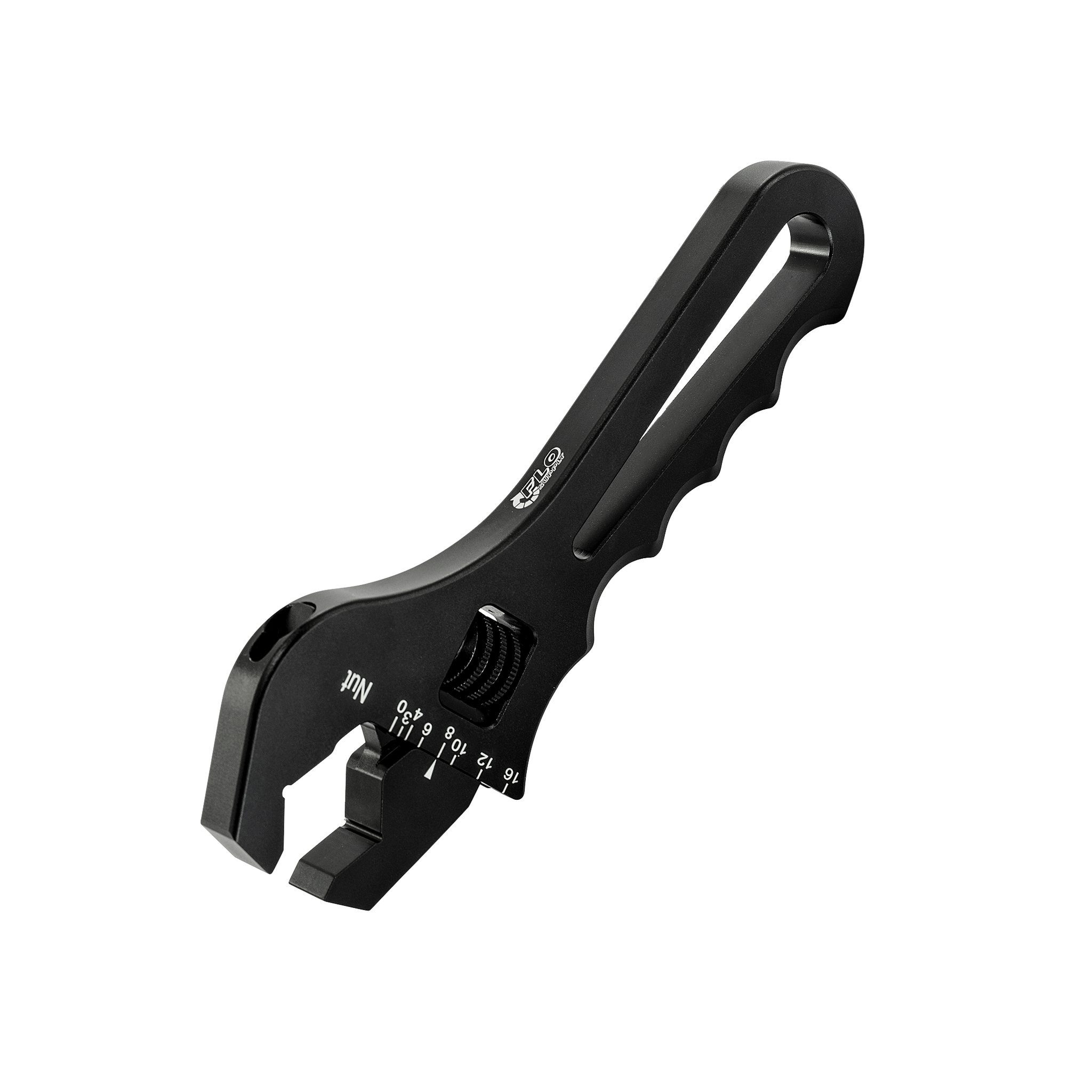 The Flo Supply V Jaw Adjustable AN Wrench is the perfect all in one solution for task that require a wide range of different wrench sizes. Quickly tighten or loosen AN Fittings by having the correct size wrench in your hand the first time. This billet aluminum wrench is anodized matte black, and laser marked for quick refence adjustments on hose end sockets or B-nuts. The V-Jaw design helps prevent marring hose ends and fittings by clamping 4 sides of the socket.