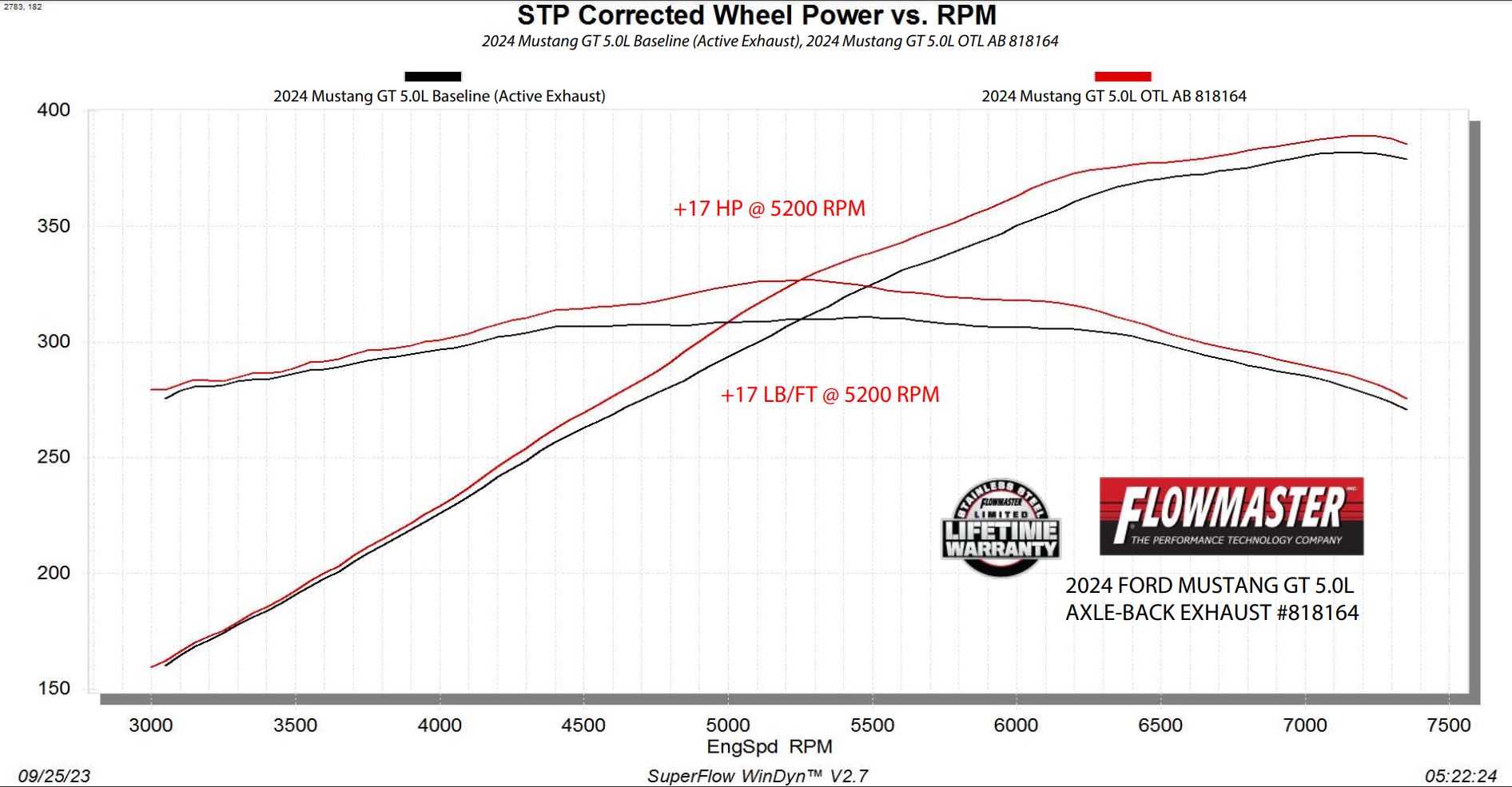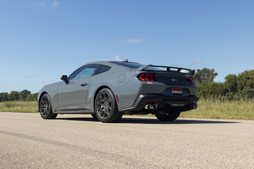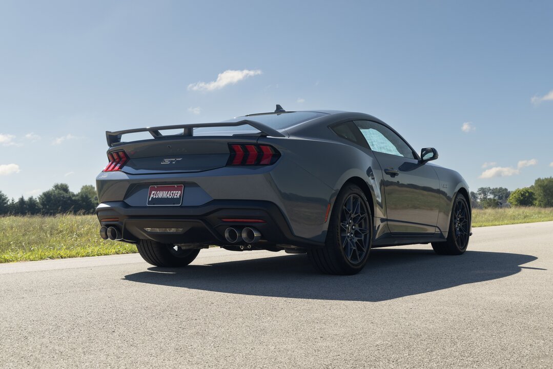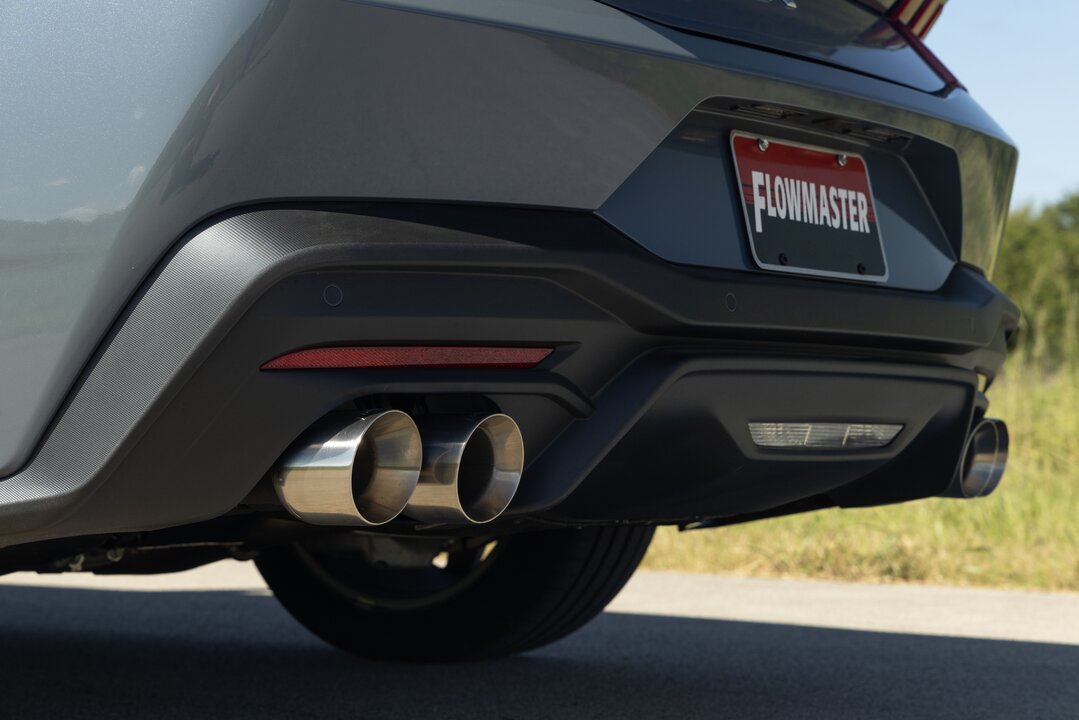 Flowmaster introduces our Outlaw Axle-back exhaust system for the 2024-2025 Ford Mustang GT with the 5.0-liter engine or EcoBoost 2.3-liter engine and the factory performance exhaust option. This system uses the Outlaw style mufflers for an aggressive exhaust tone and increased performance. Maximum dyno gains of up to 17 hp and 17 lb-ft were measured at the rear wheels. 3.00-inch mandrel bent 409 stainless steel tubing is used to maximize exhaust flow and durability. Quad 4.00-inch polished stainless steel tips are used to add a custom look to this iconic vehicle. All of the necessary hardware is included and factory mounting locations are used for an easy installation. Fits both coupes and convertibles. Backed by Flowmaster's Lifetime Limited Warranty.