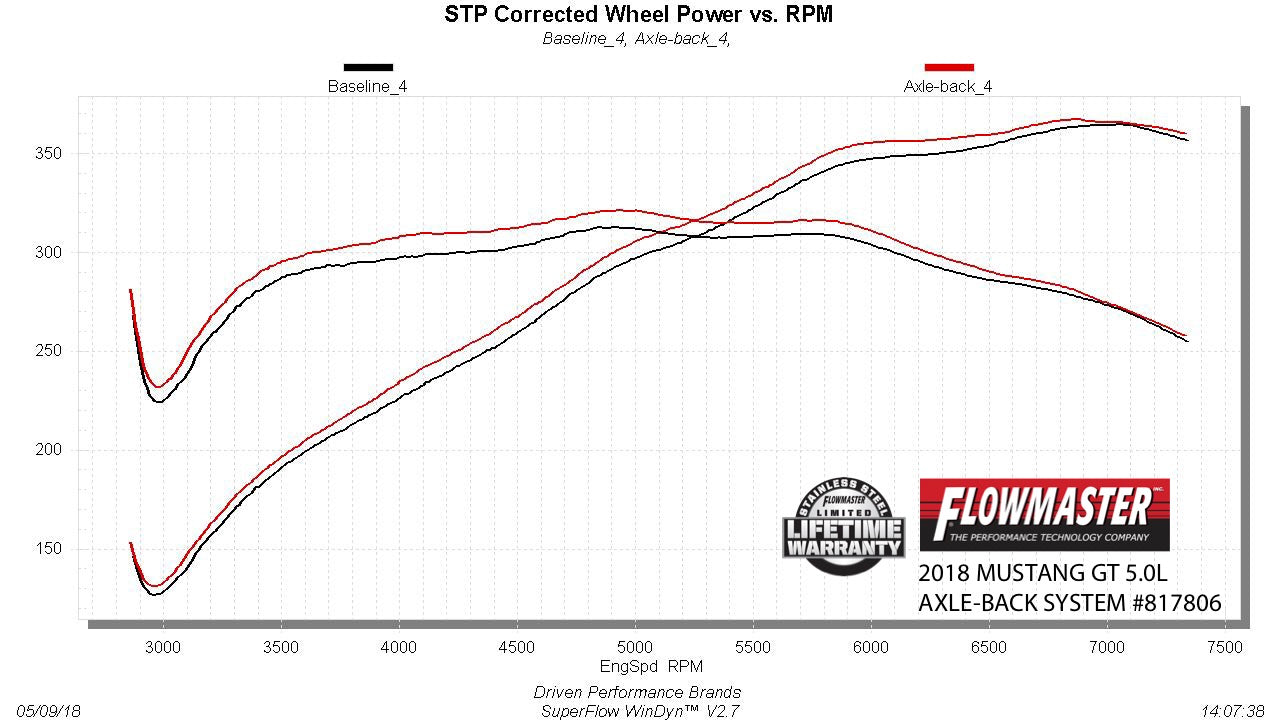 The Flowmaster® Outlaw Axle-back exhaust system is specifically designed for the 2018-2023 Ford Mustang GT coupes and convertibles with the 5.0L engine. This system features a pair of race-proven Outlaw® Series mufflers for an aggressive exterior sound level with noticeable interior sound. The system utilizes 3.00-inch mandrel-bent 409S stainless steel tubing, utilizes the factory hanger locations for an easy installation, and is finished off with quad 4.00-inch black ceramic coated tips for an aggressive look that matches the attitude of the sound. This axle-back system retains the factory resonator mid-pipe. For more sound and power, check out our Scavenger® Series no resonator X-Pipe kit part #817817. This system is designed for vehicles without active exhaust valves and includes all the necessary parts, hardware and installation instructions.