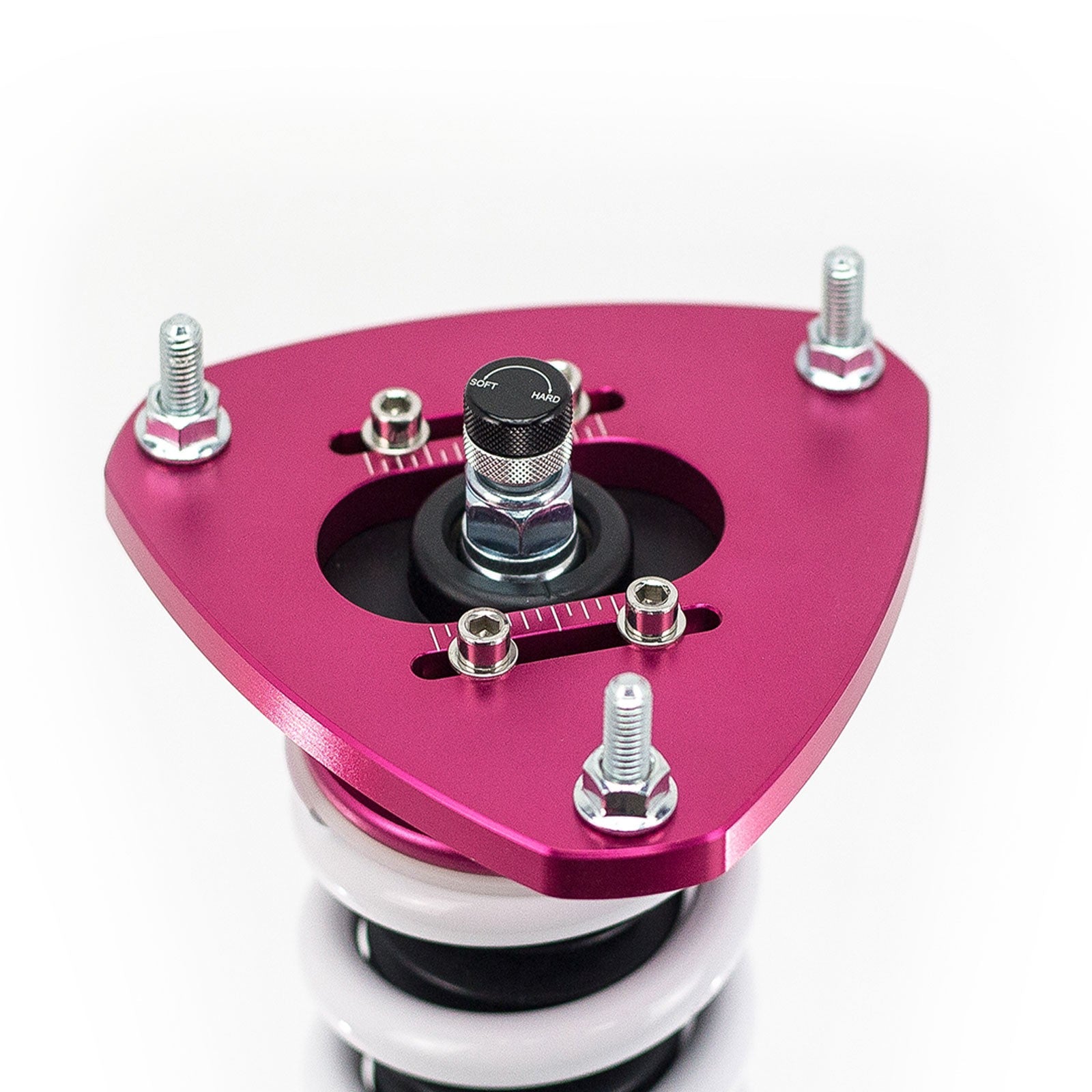 A big problem with a lot of entry level coilovers is that they use cheap shock oil, but GodSpeed doesn't follow that philosophy. Race quality shock oil ensures exceptional damper performance any any temperature, on or off the track. The GodSpeed coilover top hat uses a high performance Japanese KOYO 6204Z bearing pillowball mount (when applicable). Bottom shock brackets are also top quality and made from T7075 forged aluminum or carbon steel brackets for light weight and durability.