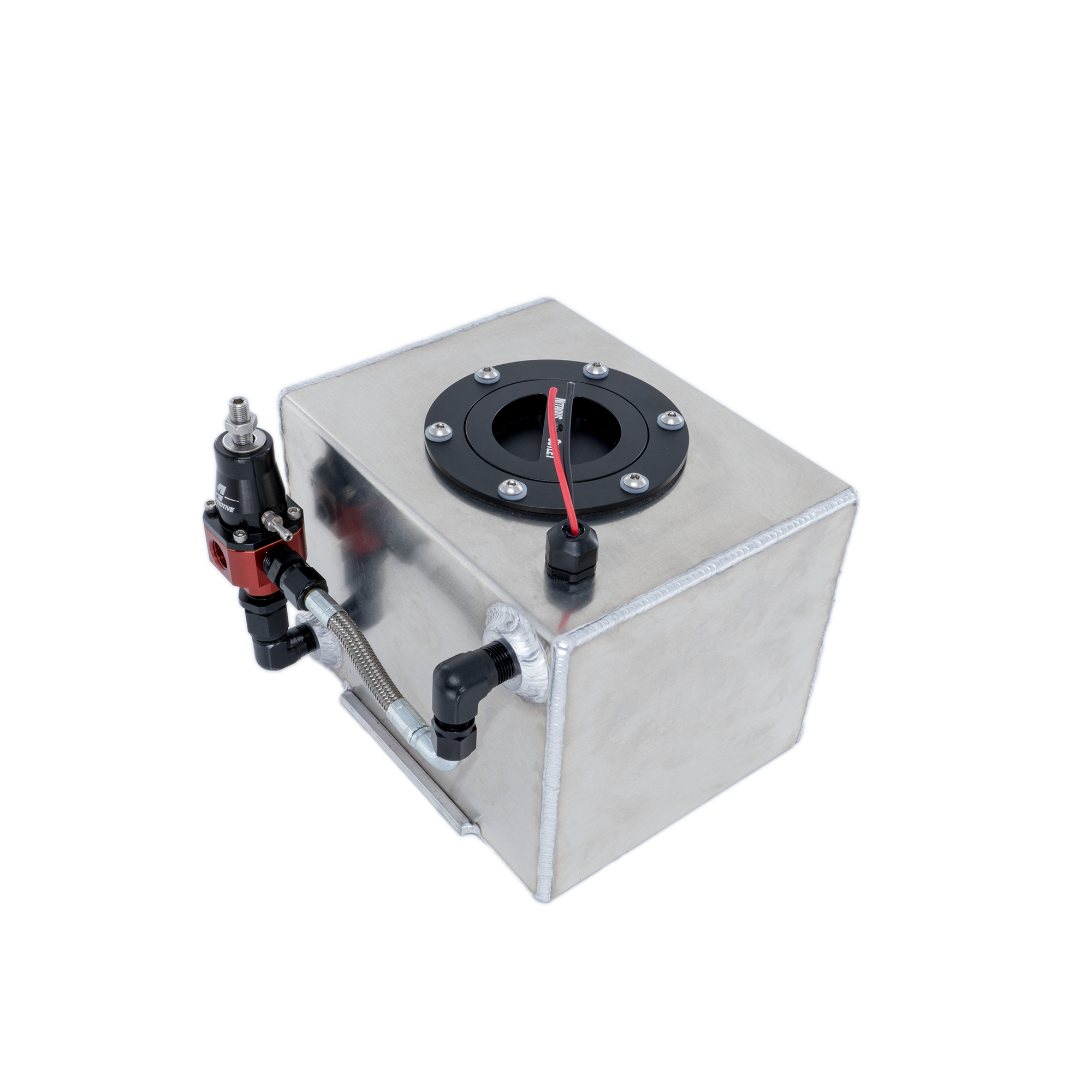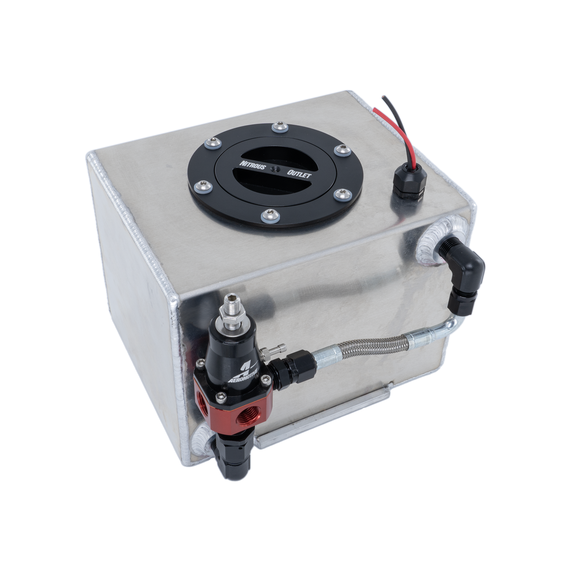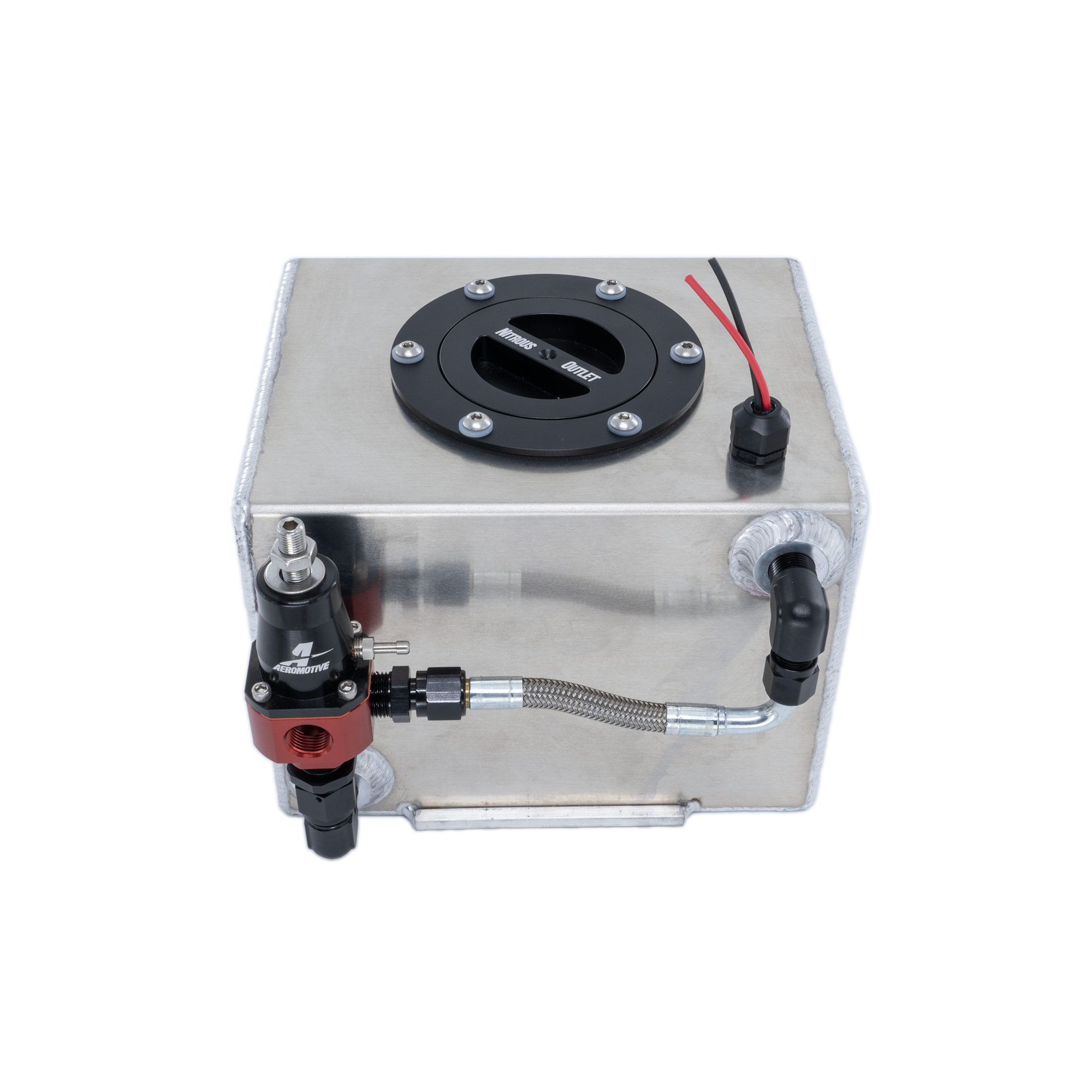 Heavy Duty Construction. Nitrous Outlet's dedicated fuel systems come complete with a custom built hand welded 1.93 gallon fuel cell, mounting brackets, E85 compatible in tank fuel pump, Aeromotive fuel regulator, Aeroquip 6 An hose, fuel lines, and fittings.