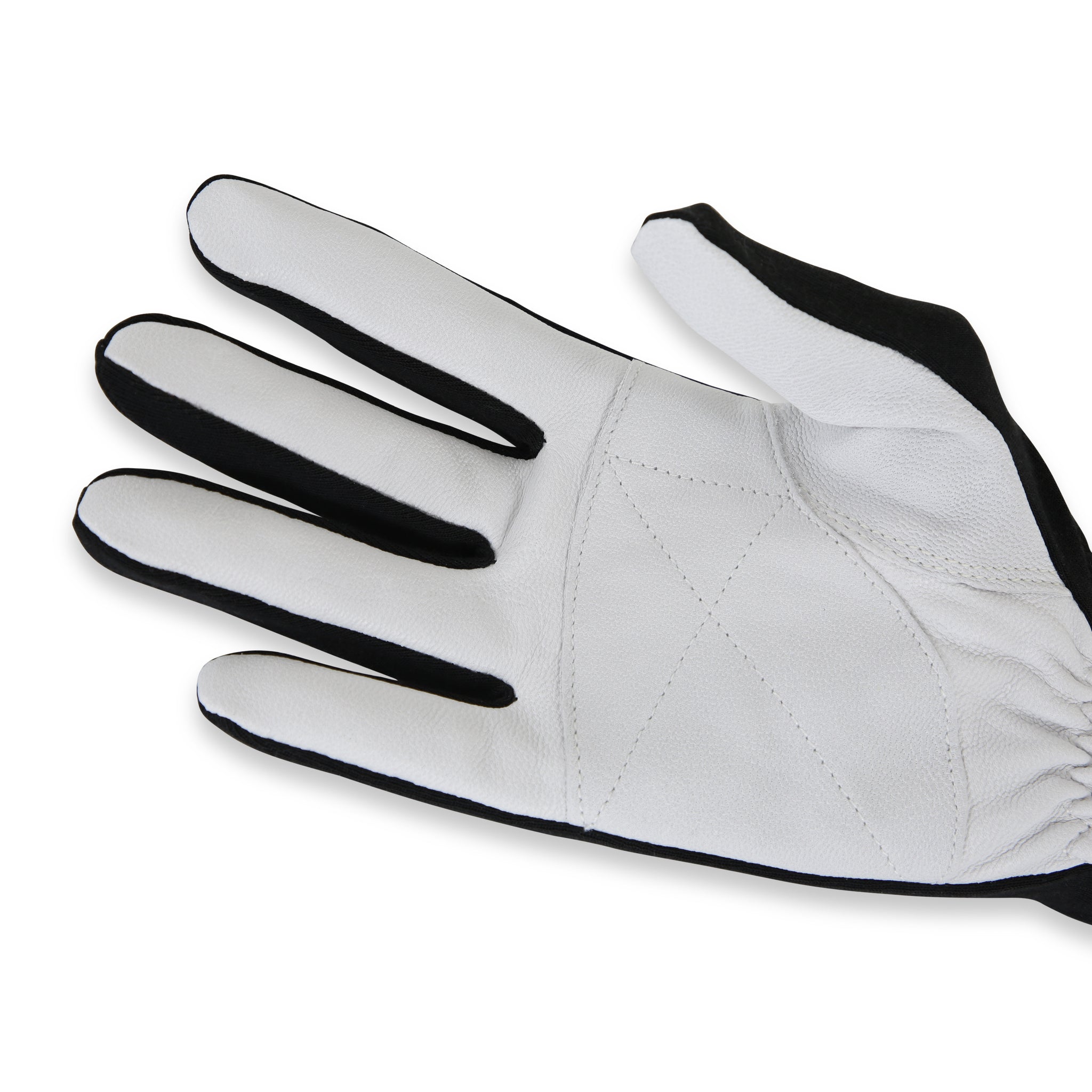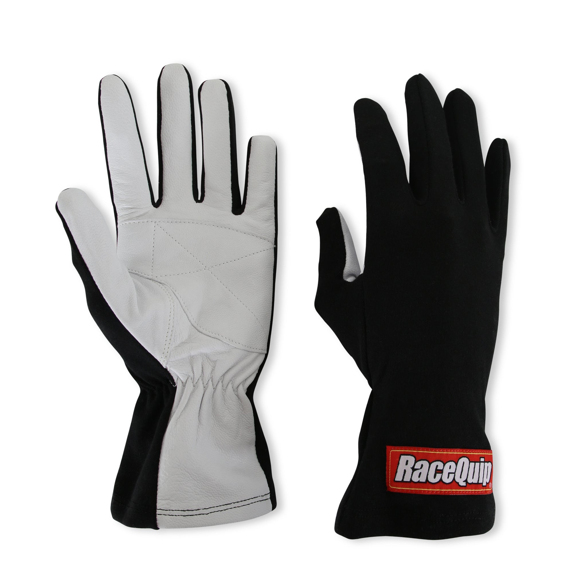 The RaceQuip 350 driving glove is a basic entry-level, one-layer, Nomex ® back, white leather palm auto racing glove. It meets the basic glove requirement with some motorsports groups. Available in black only, sizes Small - X-Large, the 350 glove is the first step to improving your grip on the steering wheel. Note: Nomex(R) construction but NO SFI rating or tag.