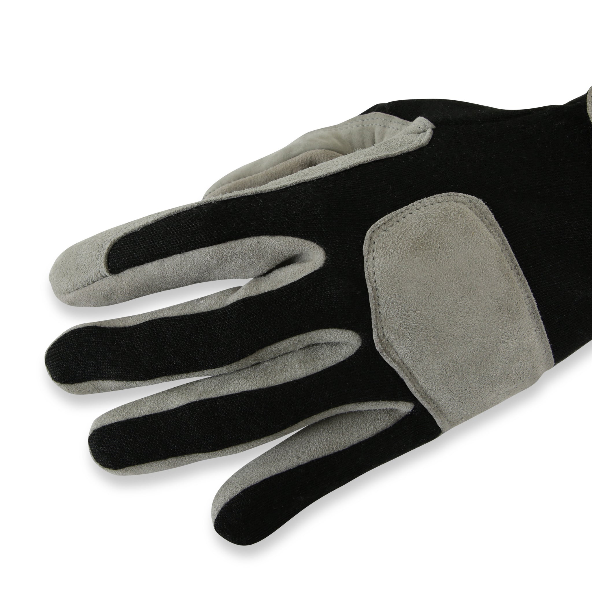 RaceQuip 351 Series auto racing gloves are a one layer Nomex® and suede leather glove built to SFI-1 specifications that provides a soft and supple feel. The grey suede leather palm adds a premium look and extra grip to this affordable SFI 3.3/1 rated driving glove. The knuckle pad and palm reinforcements attach to the Nomex® knit back in a way that promotes flexibility. Extra leather has been added between the index finger to the end of the thumb in the high-wear area. The 351 Series single layer Nomex(R) motorsports gloves feature a standard length gauntlet with an adjustable velcro(R) closure on the back to ensure a proper fit. These affordable Nomex(R) racing gloves are SFI 3.3/1 certified with SFI tags affixed to the wrist. Available in Black, Red, or Blue in sizes Small - X-Large.