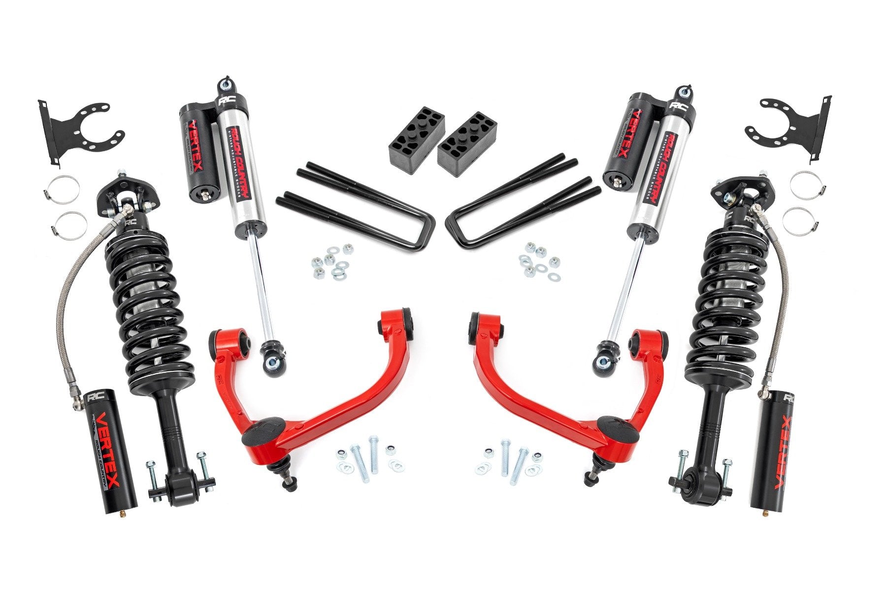 Upgrade your truck with an unbeatable combination of aggressive good looks, increased ground clearance, and premium components - all at an incredible value. Designed specifically for thirteenth-generation F-150 models, this kit delivers a hassle-free installation and enhanced performance both on and off the road.Premium Forged Aluminum Control Arms for Maximum Durability: This kit includes high-quality forged aluminum upper control arms, engineered for superior strength and easier alignment adjustments. Built with heavy-duty rubber bushings, these arms ensure long-lasting reliability while maintaining factory-like geometry. By keeping ball joints at optimum angles, they reduce stress and wear, giving your suspension an extended lifespan.Fully Configurable with All Shock/Strut Options: Customize your ride with the perfect suspension setup! Choose from nitrogen-charged N3 shocks for a balanced ride or upgrade to premium Vertex reservoir shocks for maximum performance and adjustability. Whether you're looking for comfort, off-road capability, or high-end damping control, this kit gives you full flexibility to dial in your ride quality.Balanced Stance with Increased Ground Clearance: This 3-inch lift kit levels the front and rear of your truck, eliminating factory rake and giving your F-150 a clean, aggressive stance. The included rear blocks provide additional lift while maintaining a factory-like ride. With this setup, your truck gets ample clearance for up to 34-inch tires without sacrificing drivability.Simple, Bolt-On Installation: Designed for easy installation, this kit features a 100% bolt-on process that can be completed with common tools in a home garage. No need for cutting or drilling - just a straightforward, stress-free upgrade. Plus, if you ever want to return your truck to stock, this kit allows for a full reversal with ease.Built to Last: With its durable construction and premium components, this lift kit is built to handle whatever the road throws your way. Plus, it comes backed by Rough Country's Limited Lifetime Replacement Warranty, ensuring long-term confidence in your investment.