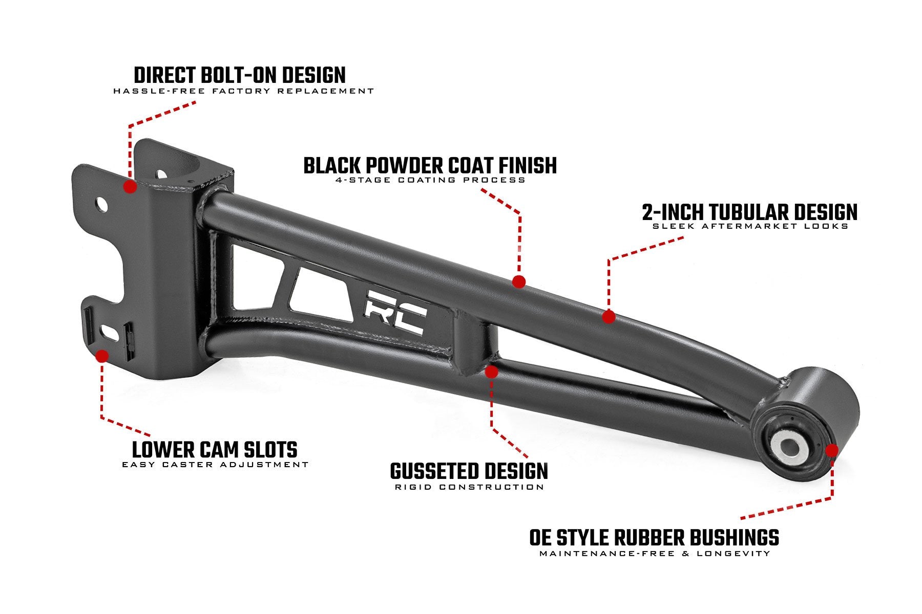 Elevate your Ford F-250/F-350 Super Duty with Rough Country's premium Tubular Radius Arms! Engineered to perfection, this upgrade kit is tailored for models with 3ΓÇ¥ or more of lift, ensuring a seamless fit and enhanced performance.Upgrade with Ease: Effortlessly install our Tubular Radius Arms on your Ford F-250/F-350 Super Duty with a 100% bolt-on design.Maximum Vibration Absorption and Longevity: Equipped with durable OE-Style Rubber Bushings, these tubular arms ensure maximum vibration absorption for a long lasting, smooth ride on any terrain.Precision Alignment: Maintain proper alignment without the need for additional drop brackets, enhancing handling and control without compromise.Stylish Design: With its sleek tubular-style design, our Radius Arm Kit adds a touch of aftermarket flair while boosting performance.Built to Last: Featuring a massive 2-inch outside diameter and gusseted design, these arms are built to withstand the toughest conditions, ensuring durability and reliability for years to come.Adjustable Alignment: Each Radius Arm includes lower cam slots to easily adjust caster for better handling on and off-road.Reform your Ford Super Duty today and conquer the road with confidence with our Tubular Radius Arm Kit!