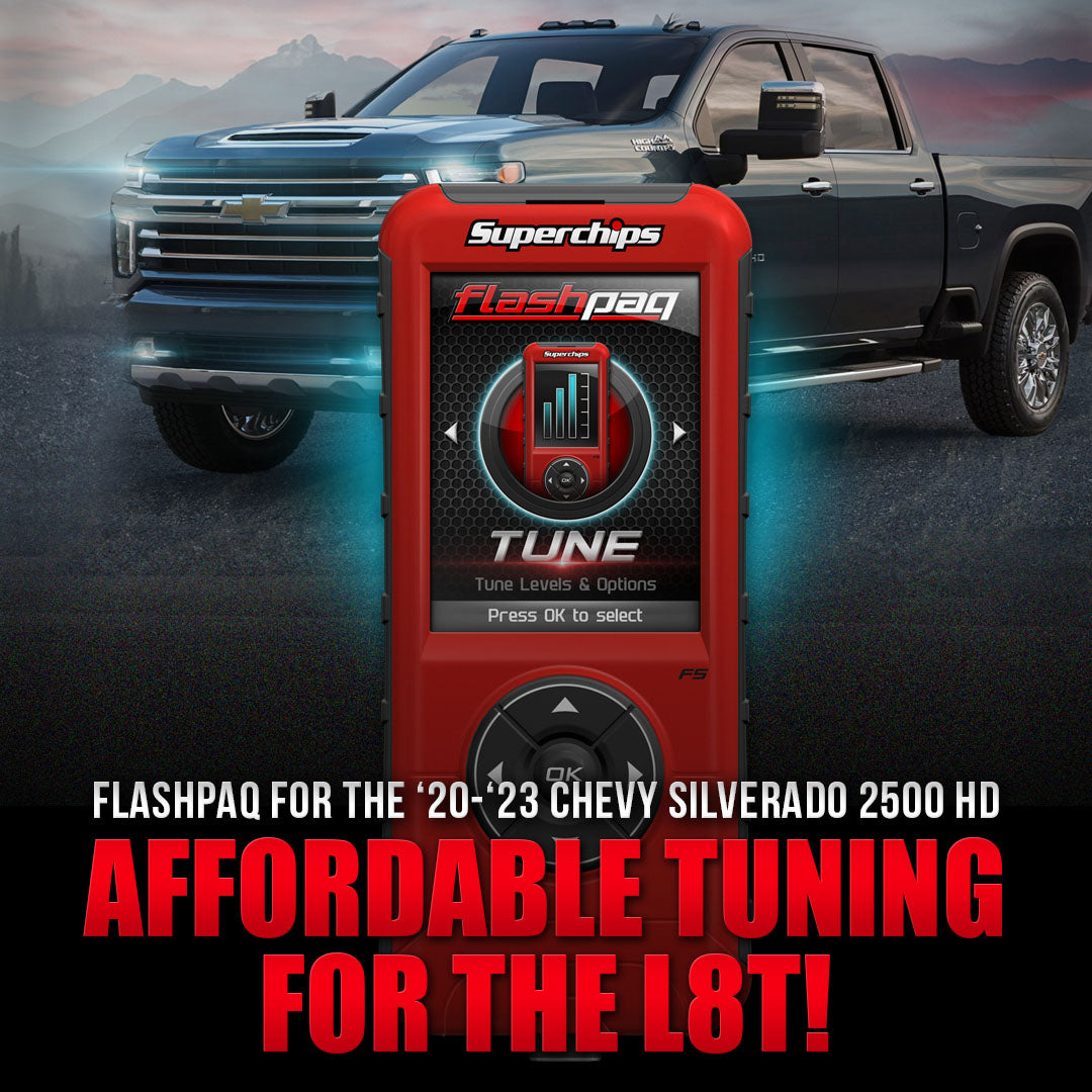 Unlock and tune your 2020-2023 GM L8T powered truck at home with our 2866-R Flashpaq kit! We provide our industry exclusive Locksmith device and ECM harness with our popular Flashpaq handheld device to give you the ability to tune without removing the ECM. Once unlocked, the provided tunes can add solid power to your 6.6L gas truck, while also improving throttle response, shifting, and more. Tunes for 87 octane, and premium fuel are provided, as well as tunes for the 6 speed transmissions. We even provide adjustments like throttle boost, speed limiter and tire size to name a few!