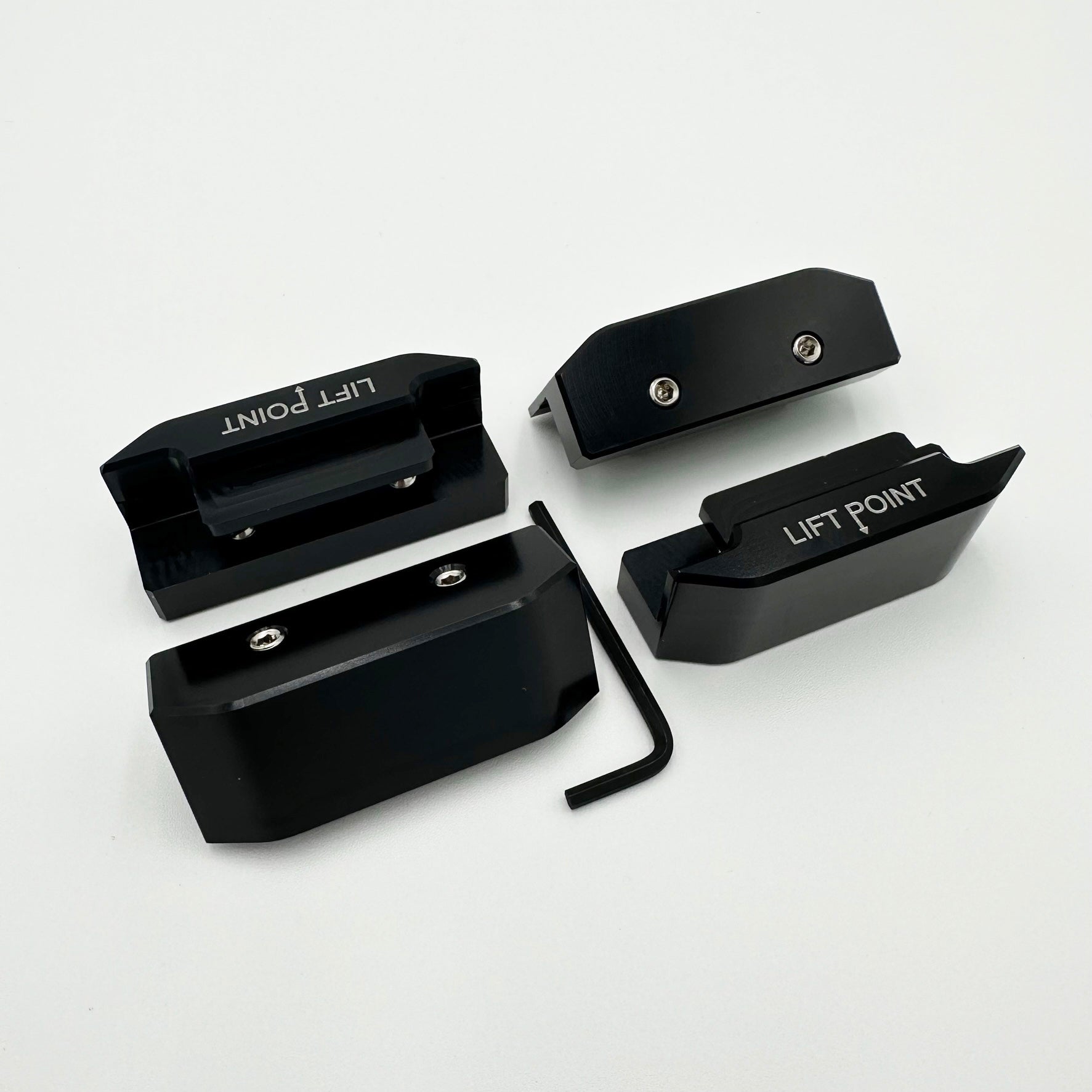 The original bolt-on lift points made in the USA for the 2013-2017 Chevy SS. Machined from American billet aluminum and designed to be left on the car. The stealth design also incorporates weight savings and a custom design.  These are angled as to not bend the pinch weld as the car is lifted by a floor jack or lift.