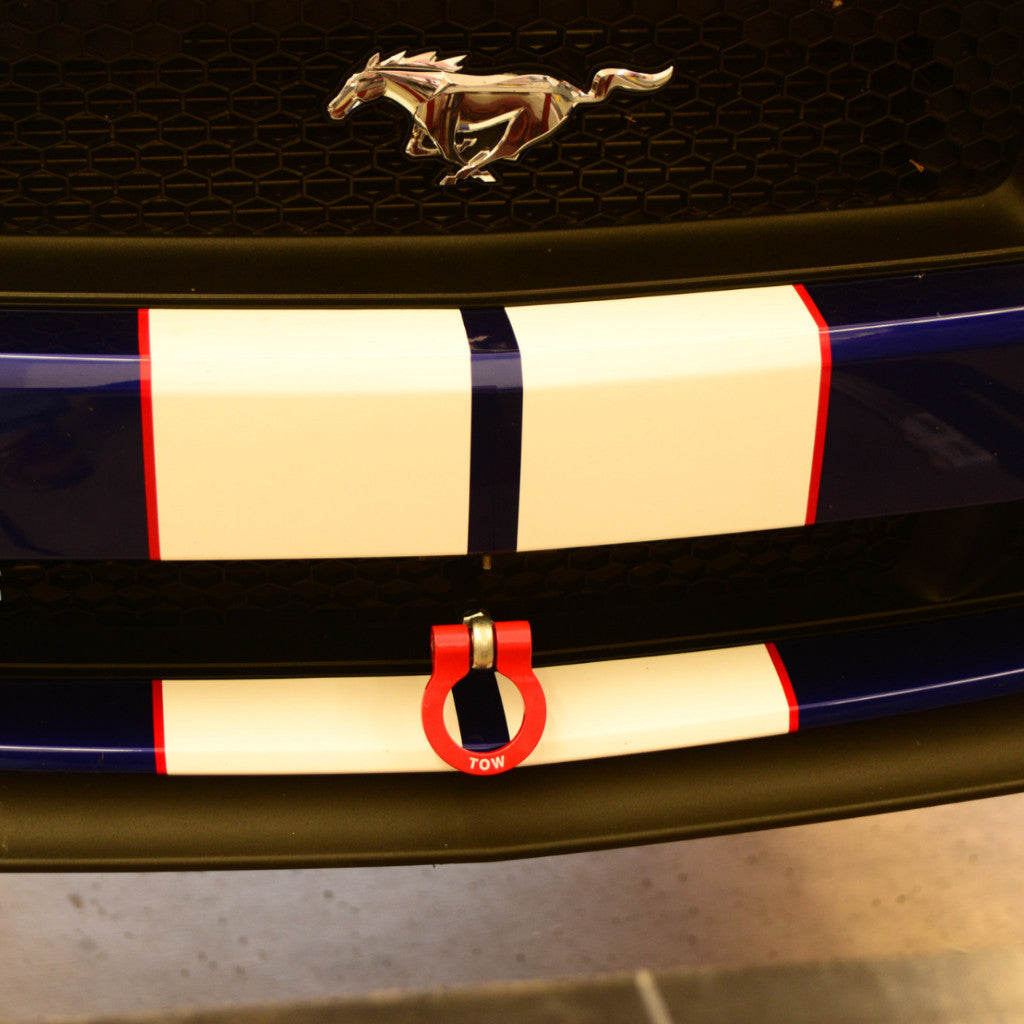 We do make a center mount tow hook for the Mustang but you will have to drill the crash bar and remove the front fascia, the tow hook installs in the center for center pulling. Just put in notes you want CENTER MOUNT.