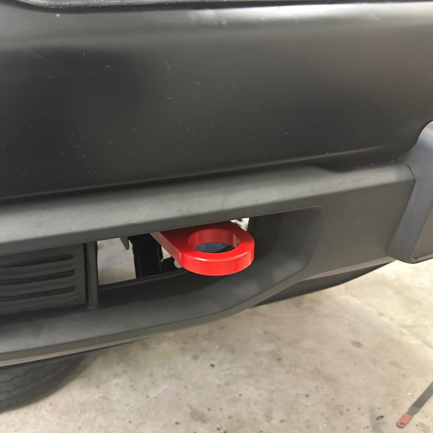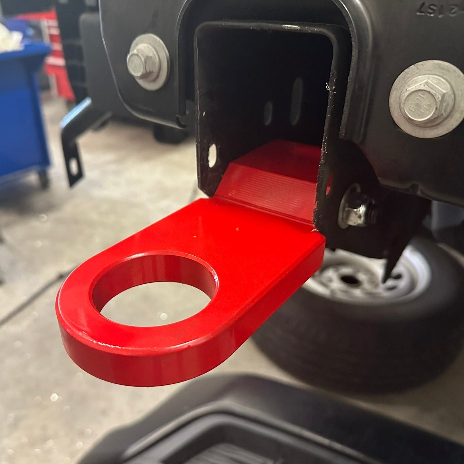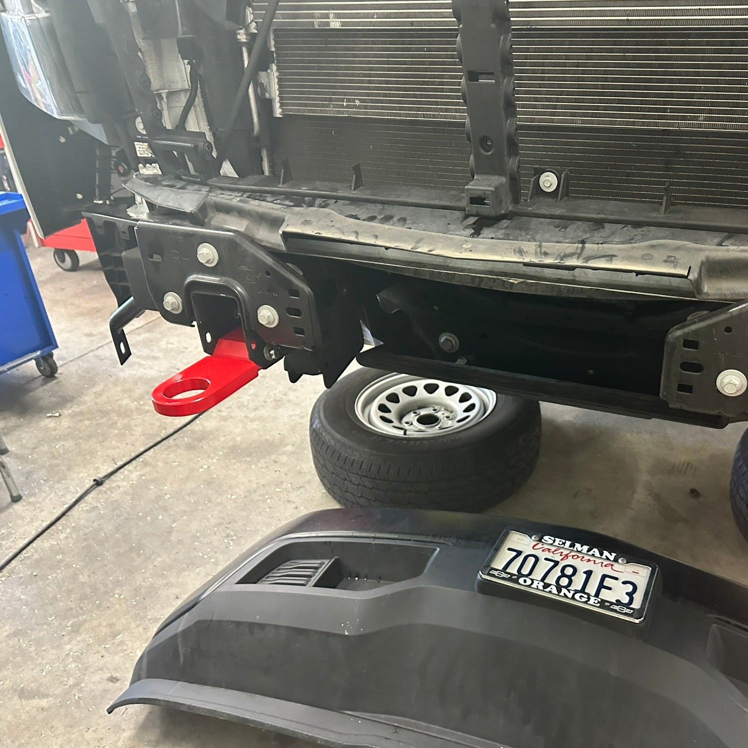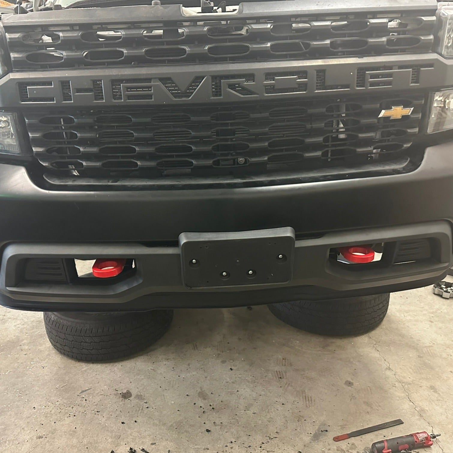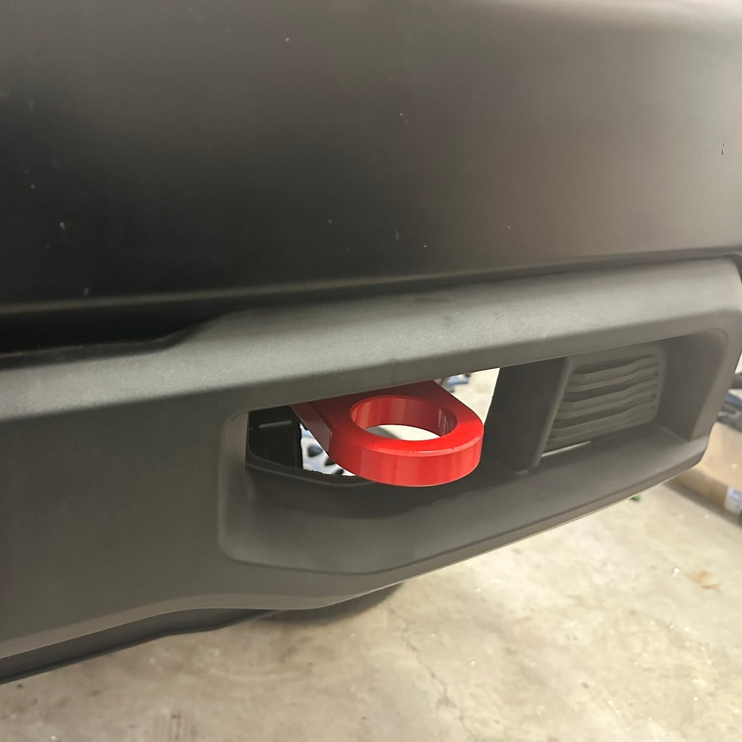 Our Silverado 2019-2024 GT4 tow hooks are a flat solid billet aluminum design and retain the form and function our customers expect that fits all models. Available with our billet aluminum D-ring that is powder coated in the color options below. This setup is sold in pairs and is designed to replace the factory option or add tow hooks for trucks that did not come with them.