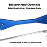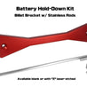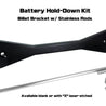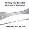 ZSPEC's Billet-Aluminum Battery Hold-Down Kit comes with a billet top-bracket and two stainless steel battery rods with stainless fasteners.