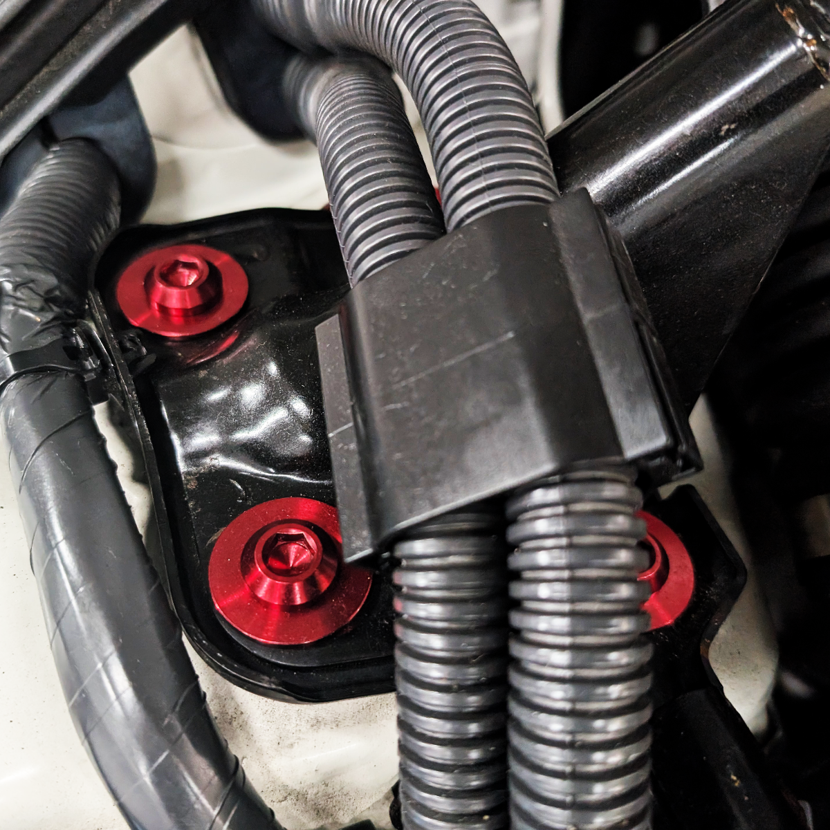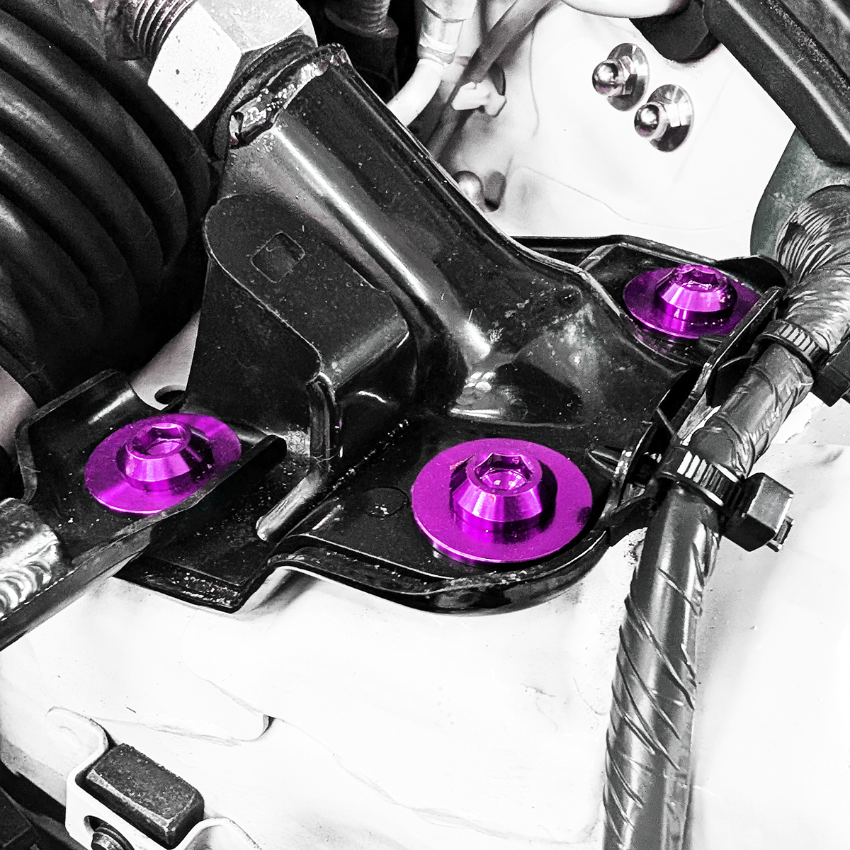 Designed for factory strut tower brace on the 350z or aftermarket ones which use OE-sized hardware.