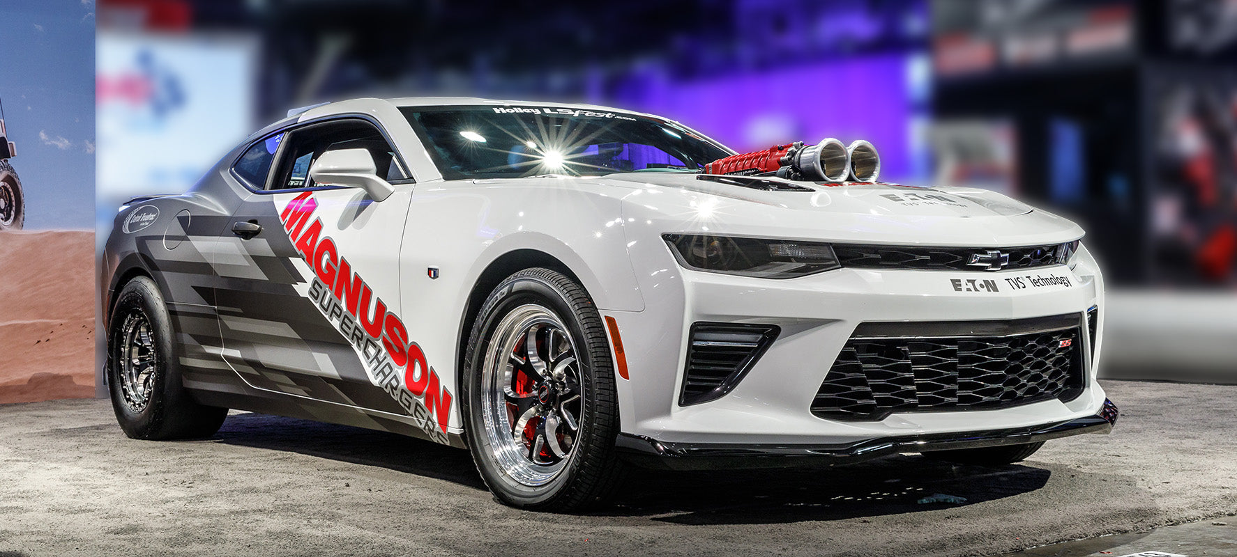 The Magnuson Superchargers 2016 Camaro was stolen earlier this year in the Detroit metro area of Michigan. Our beloved “Maggie” ,as it is known, was on the loose on the streets for a short time. Thankfully through our vast network of contacts and loyal followers Maggie was spotted and returned to us with just some cuts and bruises. But finding Maggie was made easier for a couple of reasons, in a sea of vehicles she is easy to spot. Bright, even garish, Magnuson graphics, a parachute, and the ever present IN-YOUR-FACE Dual Throttle Body intake riding the front of our 2650 Mag Drag breaching the confines of the hood.