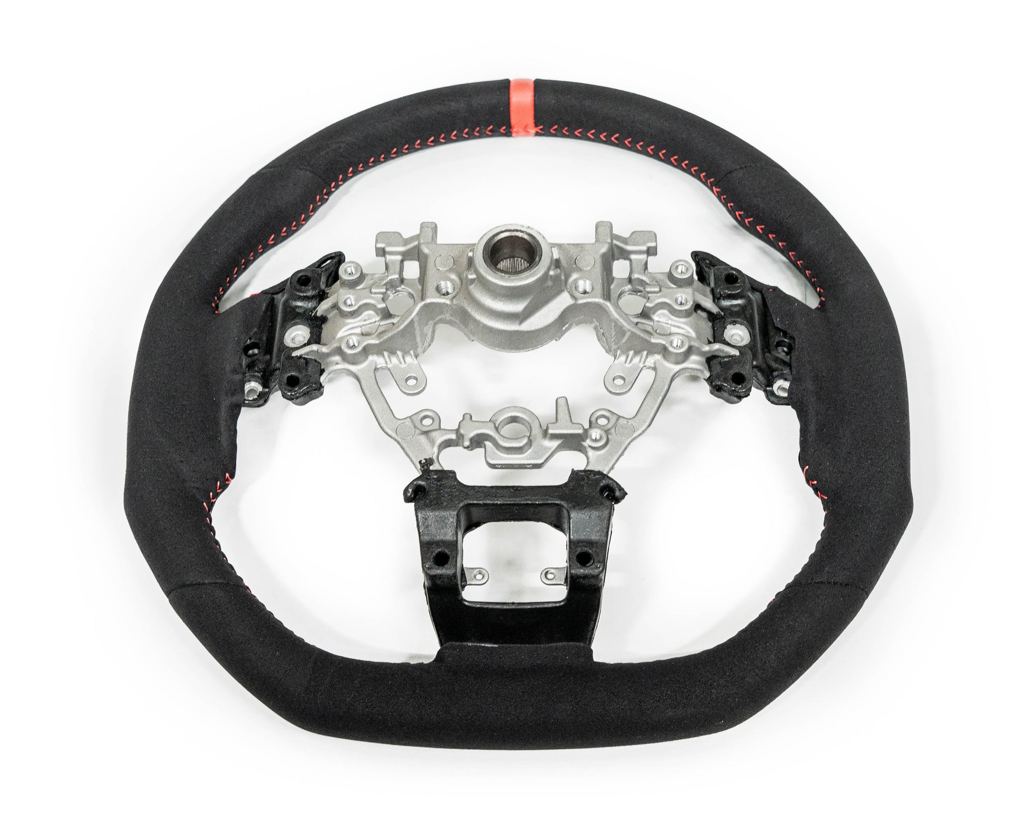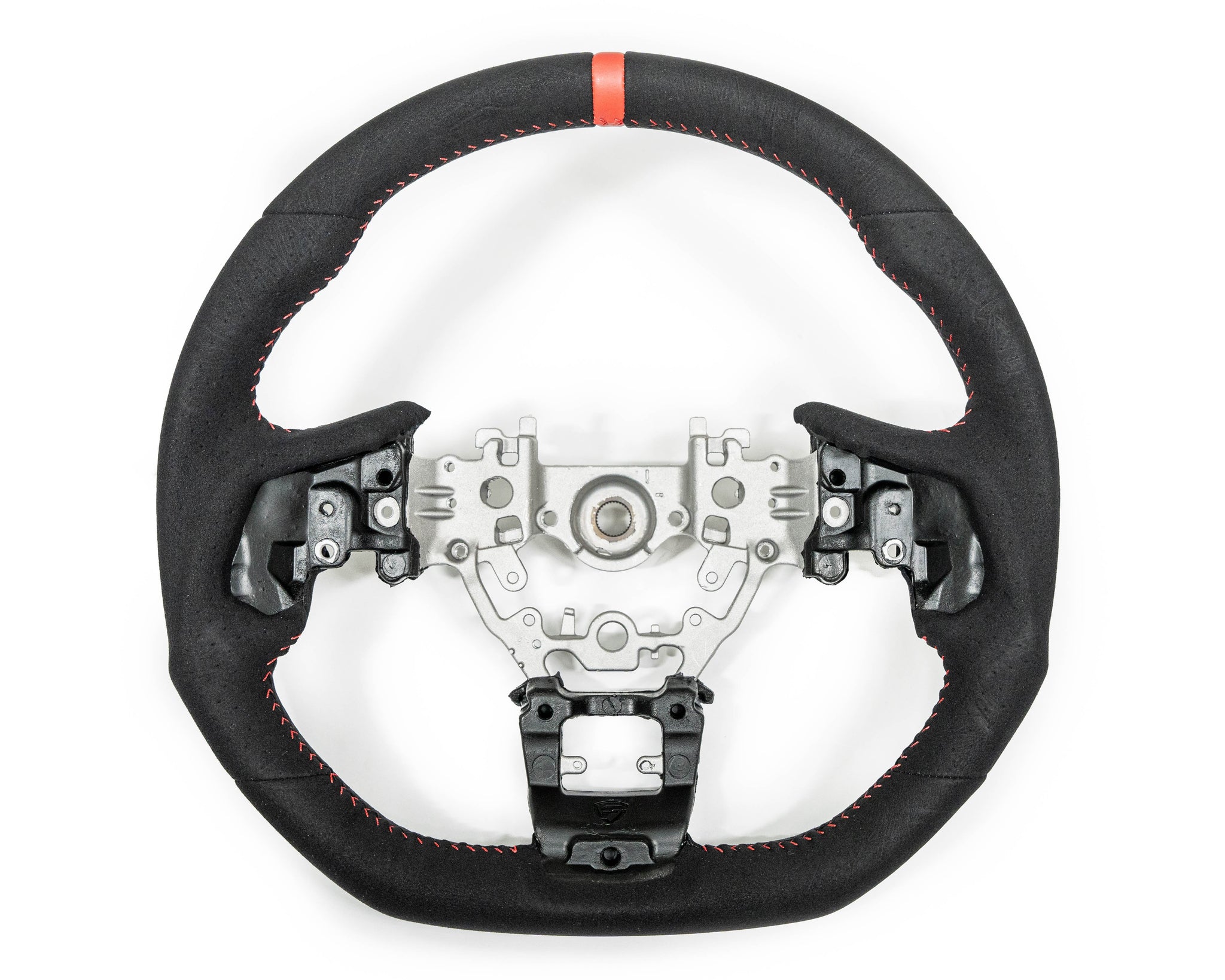 This Steering Wheel has been designed to provide the interior of your vehicle with a modern yet aggressive look while providing the driver with a race-inspired feel. The factory WRX wheel leaves much more to be desired, and as the car starts to age the materials begin the breakdown and wear out around the main contact areas. The Faction Fab steering wheel is a 100% factory replacement in higher quality and better feeling design to improve the look, feel, and your driving experience. These wheels allow you to simply remove the stock unit and replace it with the Faction Fab, and the factory airbag and controls are simply swapped over using basic hand tools. The steering wheels are available in several materials to suit your individual preference and are hand-stitched and assembled for the highest of quality and consistency. The wheels feature a D shape flat bottom design that offers a sporty feel and look. In addition, the wheels are slightly thicker than stock to give you better control and feel in your hands, which makes for an amazing driving experience when combined with the contoured shape at 3 and 9 o’clock grips.