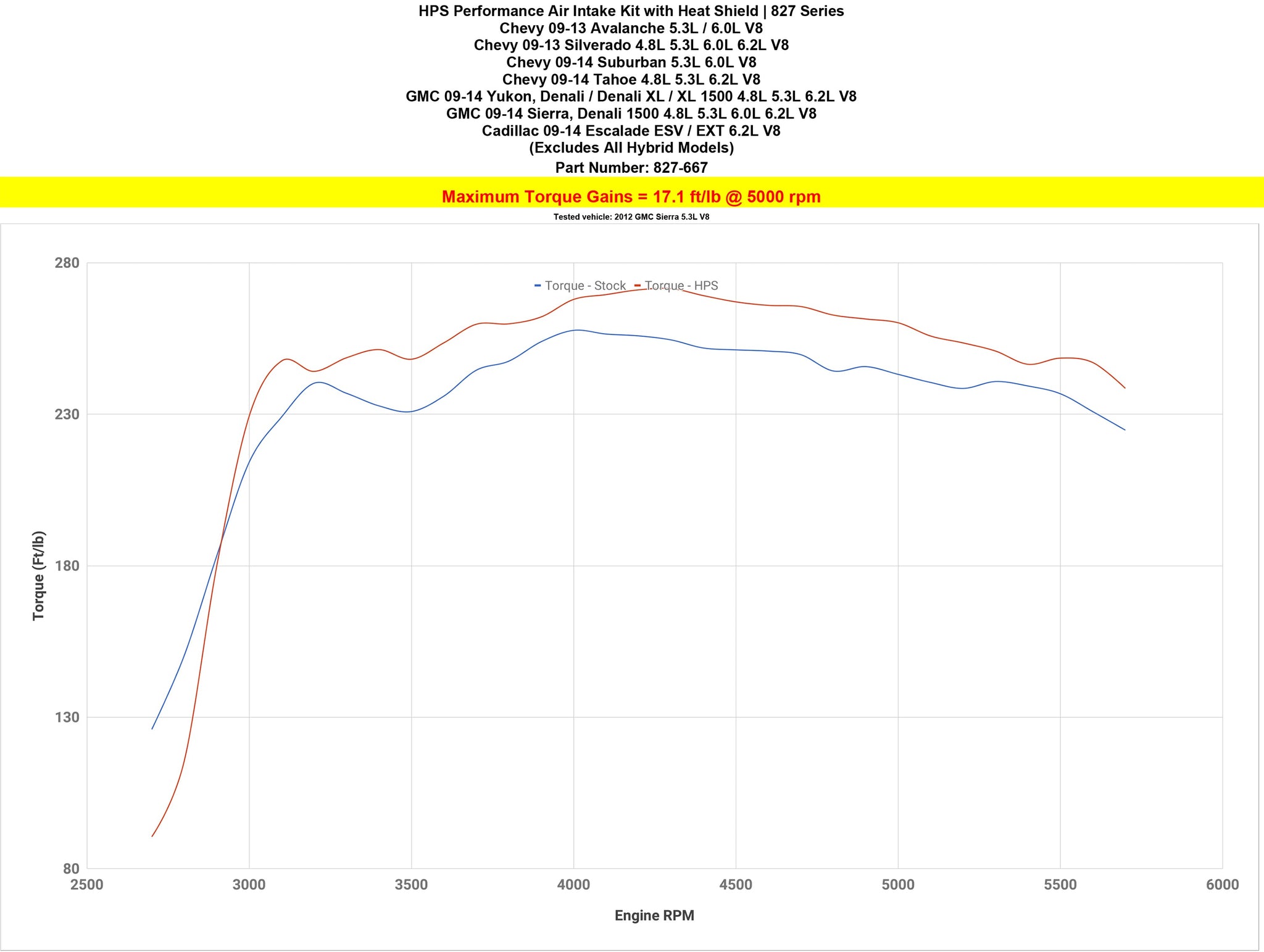 The All-New HPS Performance 827 Series Air Intake Kit (Black, Part # 827-667WB) for 2009-2014 Chevy Suburban 5.3L V8 offers a free-flowing 4 inch mandrel-bent aluminum tube induction system designed to produce dyno proven performance gains - increase horsepower +16.3 whp , torque +17.1 ft/lbs and improve throttle response while maintaining safe air fuel ratio. The heavy duty powder coated steel heat shield blocks hot air from the air filter for the best cooling effect. The included installation manual has clear pictures and instructions to guide the installer throughout the whole process. The kit does NOT require tuning and does not trigger CEL light. No modification is required during the installation. HPS light weight mandrel-bent aluminum alloy tube replaces the stock restrictive air box and optimizes the airflow with excellent heat dissipation and long lasting durability. HPS Performance 827 Series air intake kit features race proven reinforced silicone hoses and industrial grade 100% stainless steel T-bolt clamps which ensures reliability, even during the most extreme driving conditions. The All-New HPS Performance Air Filter is designed with performance in mind, delivering excellent filtration without sacrificing airflow. All HPS Performance Air Filters are made in the United States.