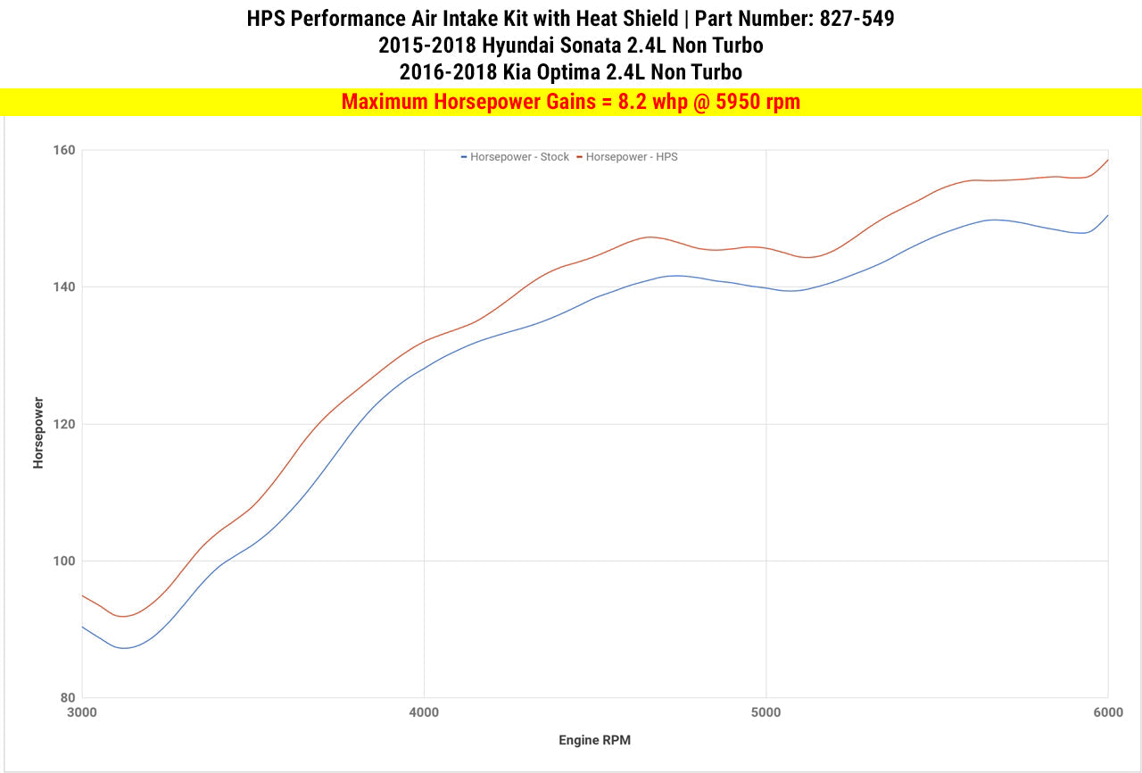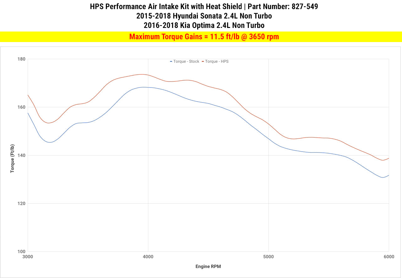 The All-New HPS Performance 827 Series Air Intake Kit (Red, Part # 827-549R) for 2016-2018 Kia Optima 2.4L Non Turbo offers a free-flowing 3 inch mandrel-bent aluminum tube induction system designed to produce dyno proven performance gains - increase horsepower +8.2 whp , torque +11.5 ft/lbs and improve throttle response while maintaining safe air fuel ratio. The included heat shield blocks hot air from the air filter for the best cooling effect. The included installation manual has clear pictures and instructions to guide the installer throughout the whole process. The kit does NOT require tuning and does not trigger CEL light. No modification is required during the installation. HPS light weight mandrel-bent aluminum alloy tube replaces the stock restrictive air box and optimizes the airflow with excellent heat dissipation and long lasting durability. HPS Performance 827 Series air intake kit features race proven reinforced silicone hoses and industrial grade 100% stainless steel T-bolt clamps which ensures reliability, even during the most extreme driving conditions. The All-New HPS Performance Air Filter is designed with performance in mind, delivering excellent filtration without sacrificing airflow. All HPS Performance Air Filters are made in the United States.