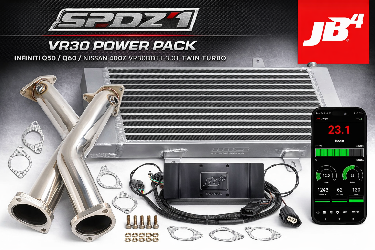 Take your VR30 platform to the next level with the ultimate SPDZ1 Power Pack, combining industry-leading tuning, airflow upgrades, and race-grade cooling into one complete solution. Designed for the Infiniti Q50, Q60, and 2023+ Nissan 400Z, this package delivers massive horsepower gains, improved reliability, and a driving experience that transforms your car from stock to seriously capable.